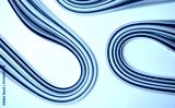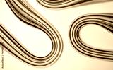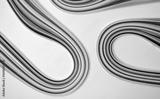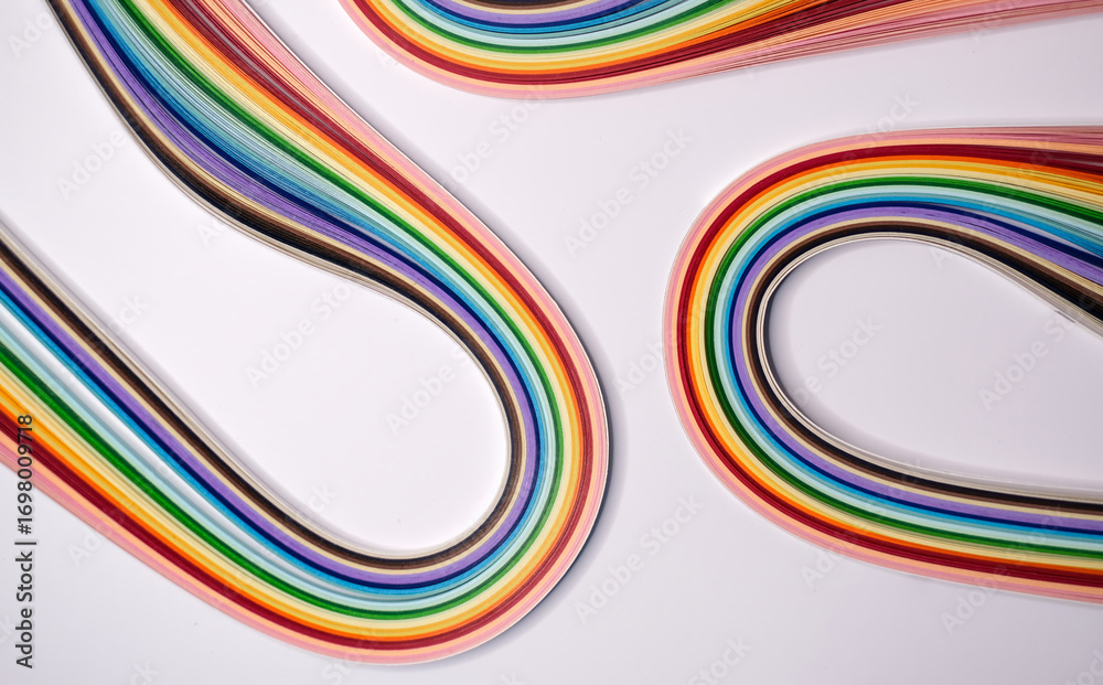 A creative flat lay showcasing a collection of colorful paper quilling strips arranged into abstract, curving shapes on a white background