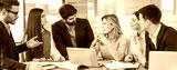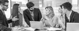 Colleagues attentively listening to female director presenting ideas for continued business success