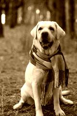 A Labrador Retriever wearing a cozy brown scarf sitting on autumn forest ground, looking happy and friendly. Perfect seasonal pet portrait for lifestyle, fashion, and animal themes.