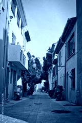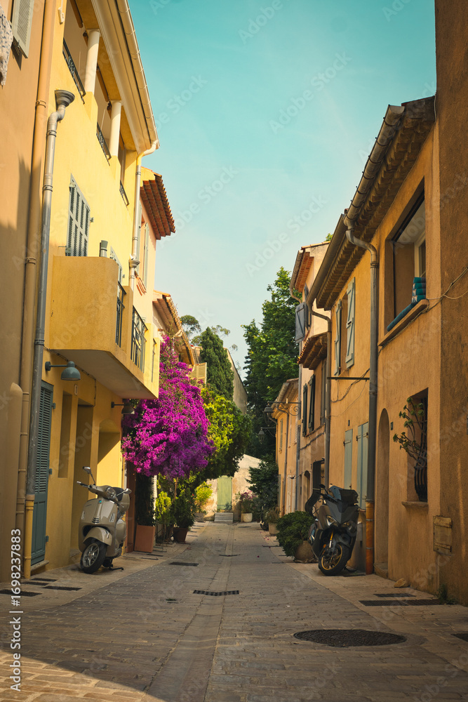 Charming sunlit street in St. Tropez with cobblestone pavement, pastel buildings, and blooming flowers