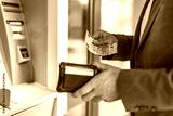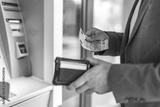 Man Using ATM and Handling Euro Banknotes in a Modern Banking Setup
