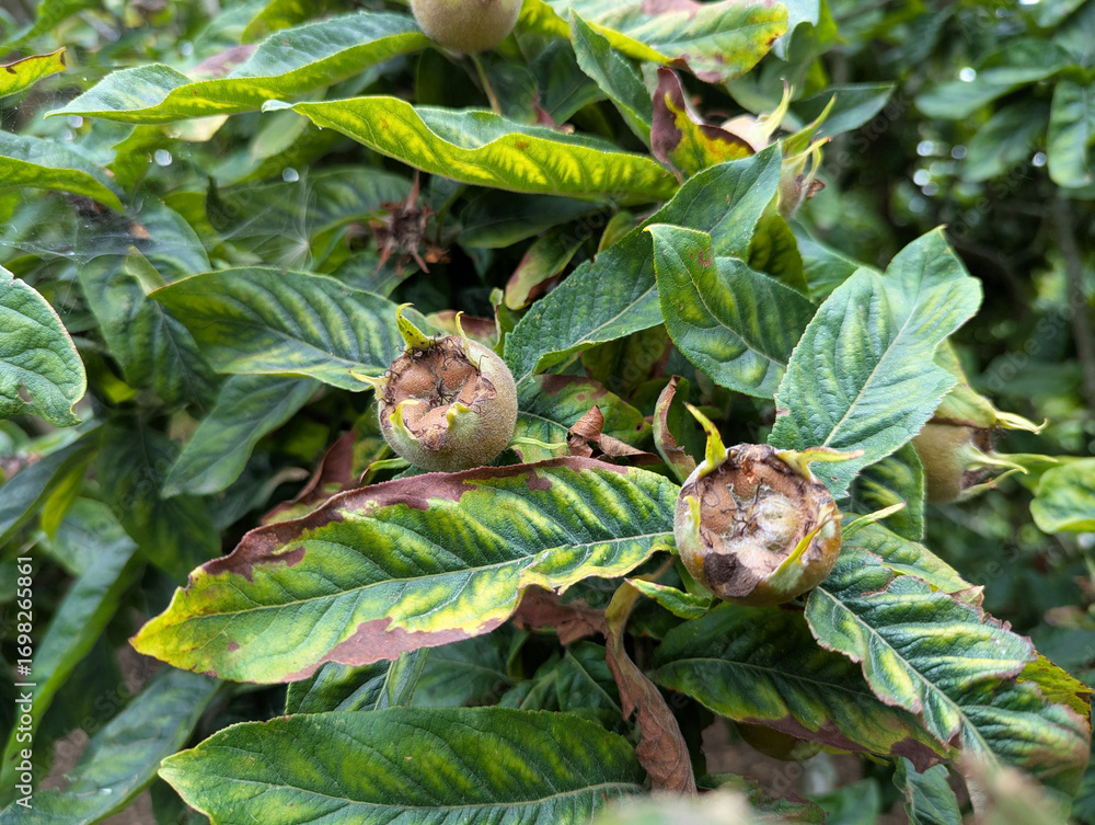 A closeup view of the medlar fruit from the Mespilus germanica shrub.