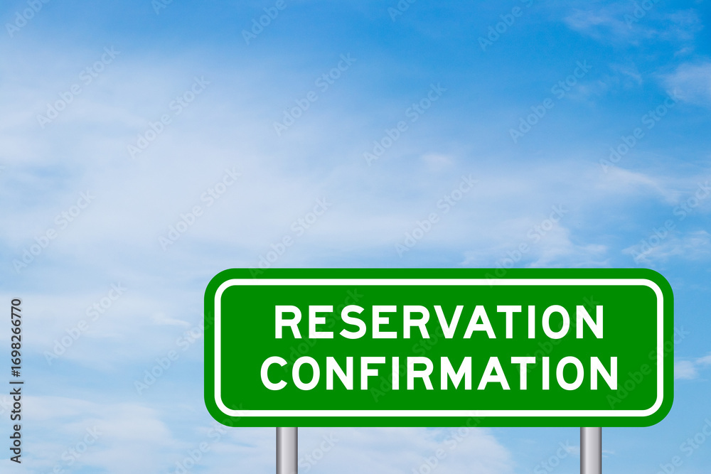Green color transportation sign with word reservation confirmation on blue sky with white cloud background