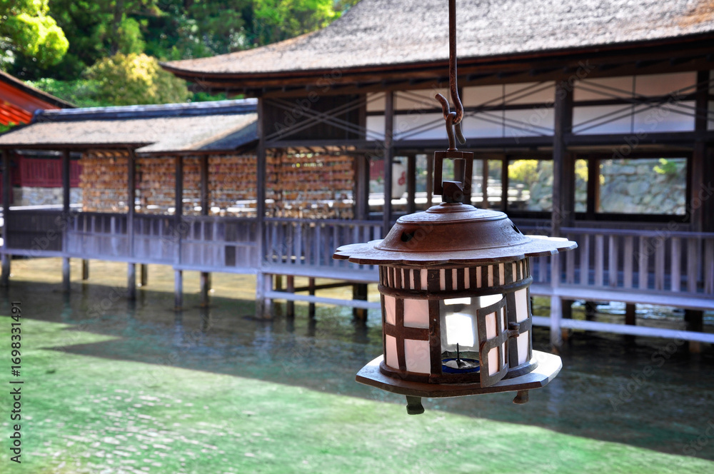 Japanese lantern at Itsukushima Jinja shrine, shinto temple, Miyajima island, Japan