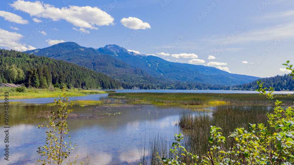 Alta Lake, Whistler, BC, in Summer, viewed from Rainbow Park with mountain backdrop.