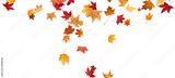 Falling leaves, autumn foliage on transparent background, beautiful background of orange and gold leaves. Vector maple leaf, png, flying foliage from tree.