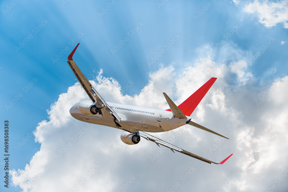 White passenger airplane flying in the sky amazing clouds in the background - Travel by air transport