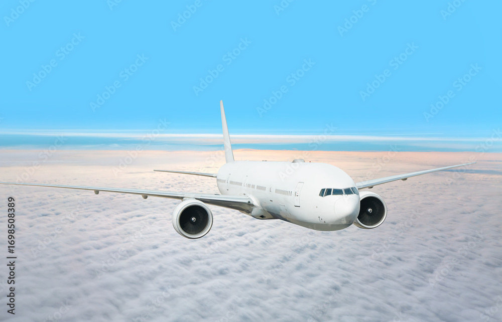White passenger airplane flying in the sky amazing clouds in the background - Travel by air transport