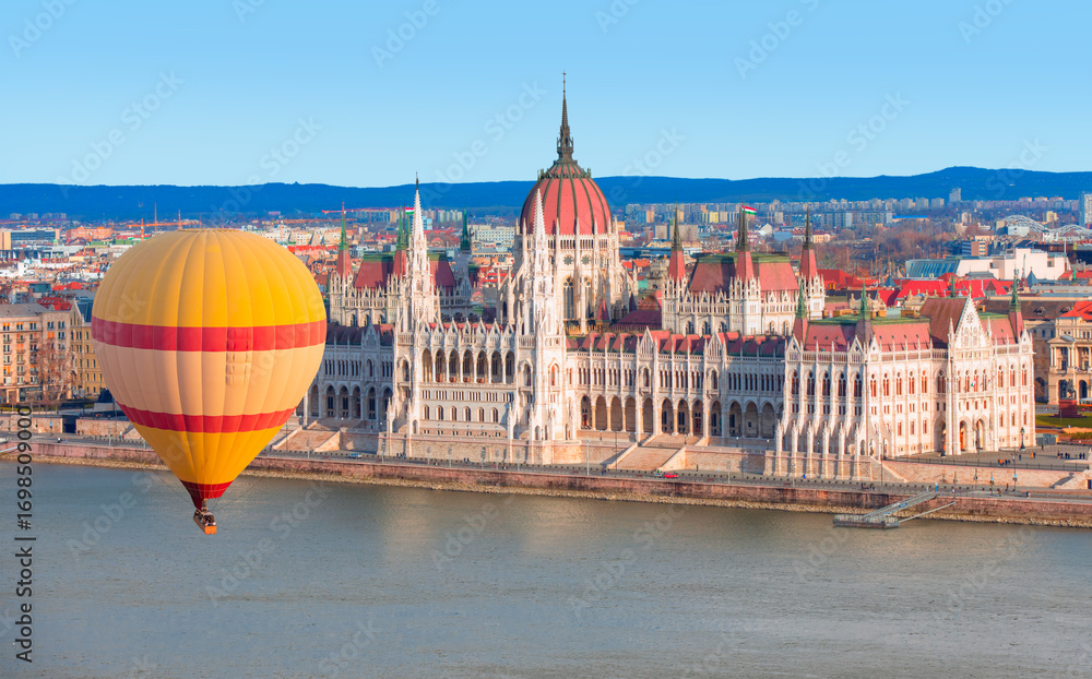 Hot air balloon flying over Budapest Parliament building at dusk on the Danube river - Budapest, Hungary