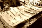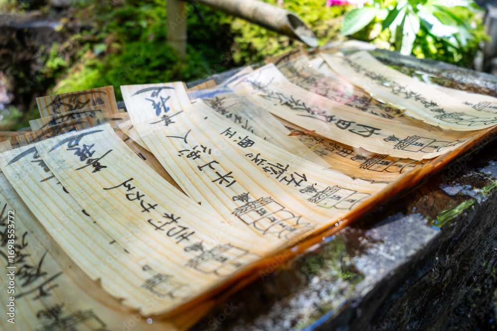 Water-soaked omikuji at Mitaki-Dera temple in Hiroshima, Japan