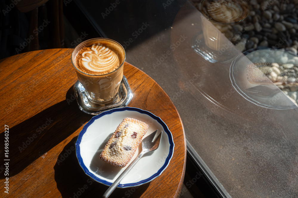 Hot coffee latte with latte art milk foam in cup mug and Homemade Currant financier cake on top view. As breakfast In a coffee shop at the cafe,during business work concept,vintage style