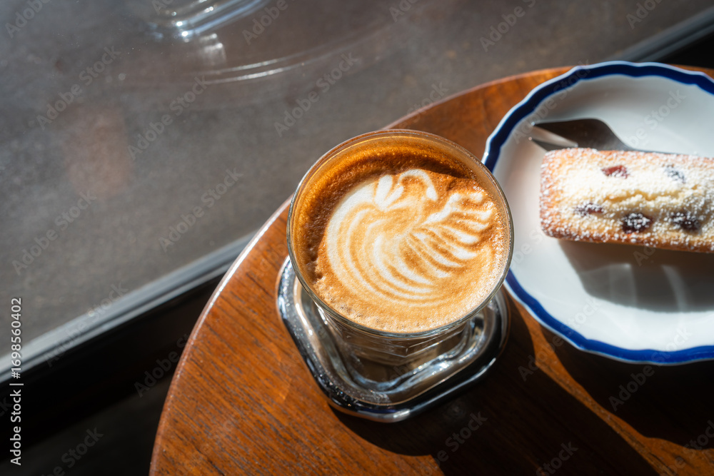 Hot coffee latte with latte art milk foam in cup mug and Homemade Currant financier cake on top view. As breakfast In a coffee shop at the cafe,during business work concept,vintage style