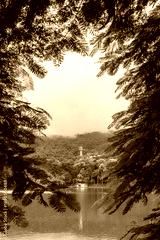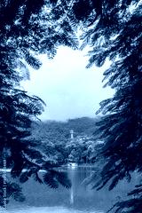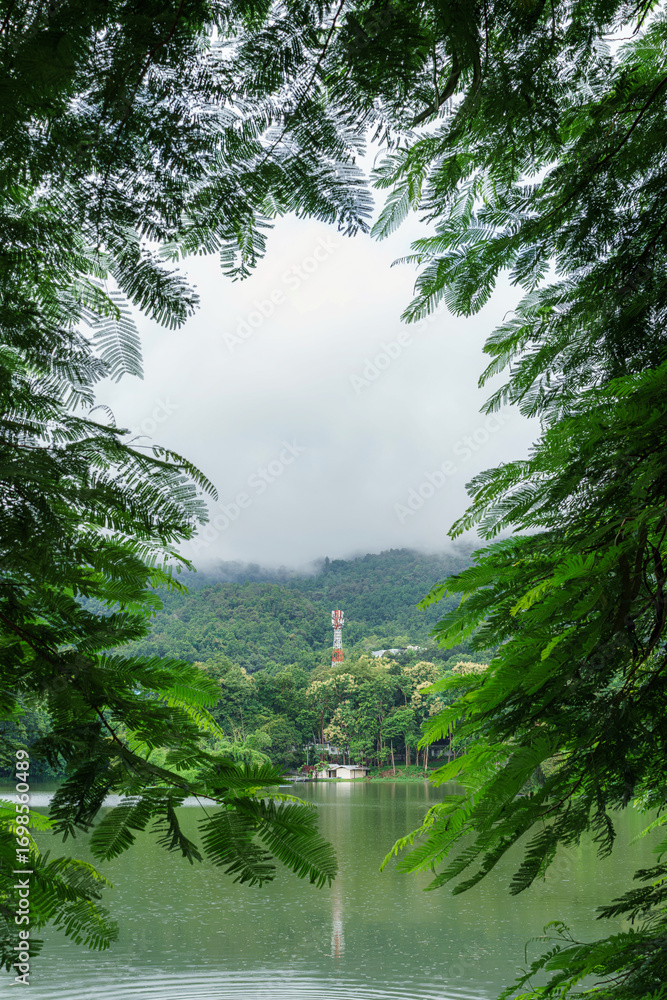 landscape lake views at Ang Kaew Chiang Mai University in nature forest Mountain atmosphere rain fog sky abstract with white clouds. cloudy sky background
