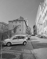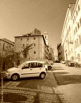 Cobblestone street in Rome, with a mix of parked cars and historic buildings. The street curves uphill, revealing a bell tower in the background and a variety of traditional Roman architecture
