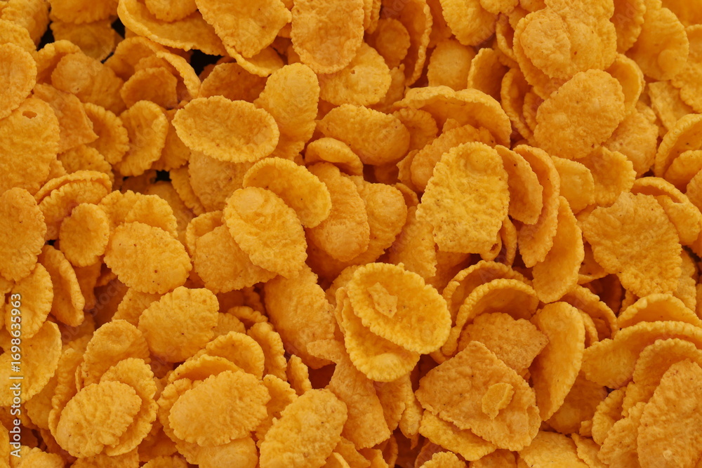 Corn flakes background and texture. Top view cornflake cereal for morning breakfast