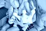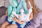 Young caucasian girl with soft toy collection in pastel colors sitting indoors.