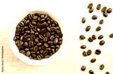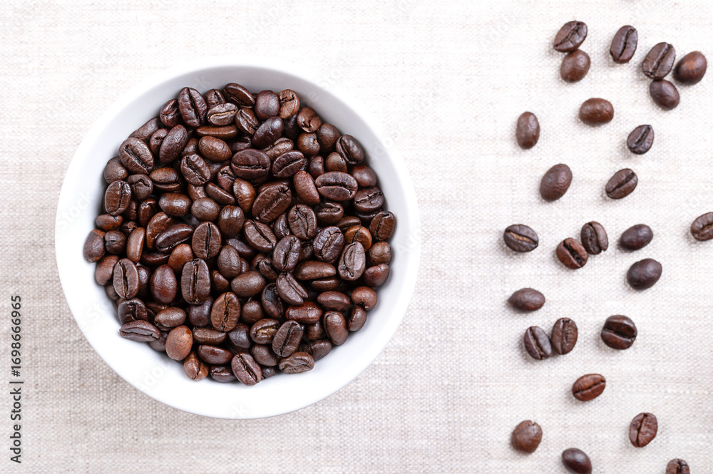 Roasted Arabica coffee beans, in a white bowl, on linen. Dark brown roasted whole seeds of berries from Coffea arabica, also known as Arabian, mountain or Arabica coffee. Close-up, from above. Photo