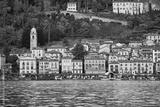 Bellagio, Italy. Picturesque town at lake Como. Colourful motley Mediterranean houses stone beach coastline among green trees. Popular health resort and touristic location. Summer day landscape.