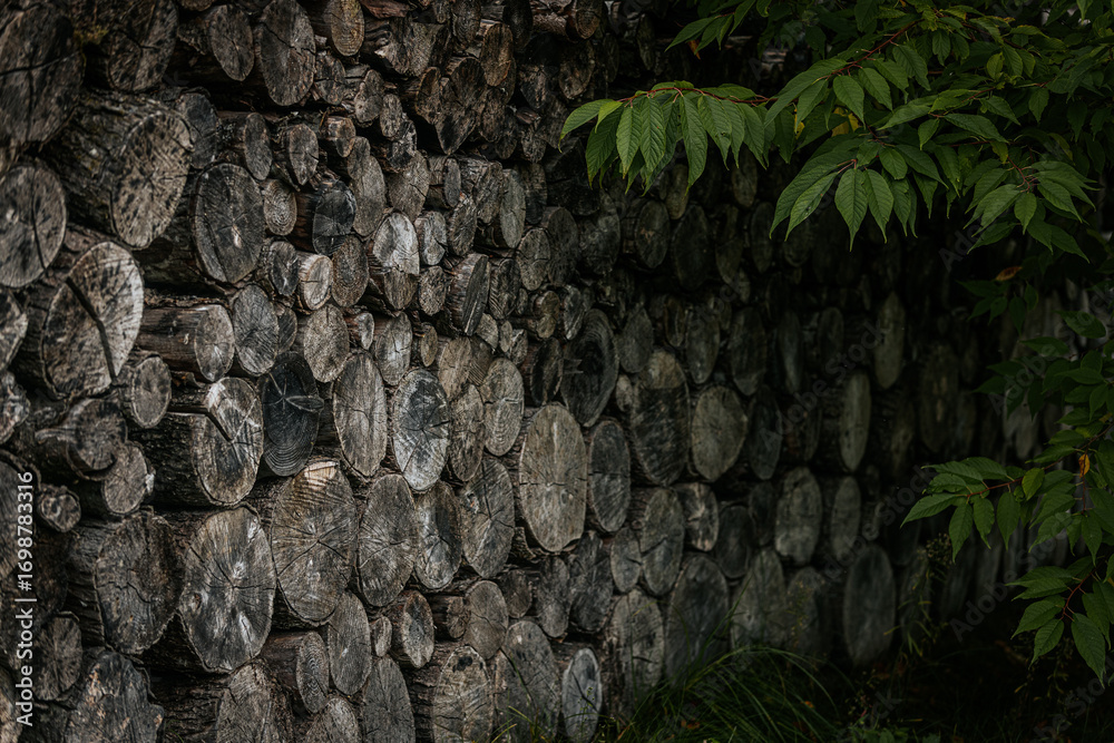 A large stack of firewood logs forms a rustic wall, partly shaded by green leaves and grass at the bottom.