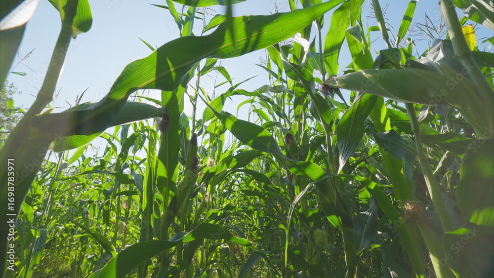 A sunlit cornfield viewed through green leaves, showcasing the vibrancy of nature and agriculture