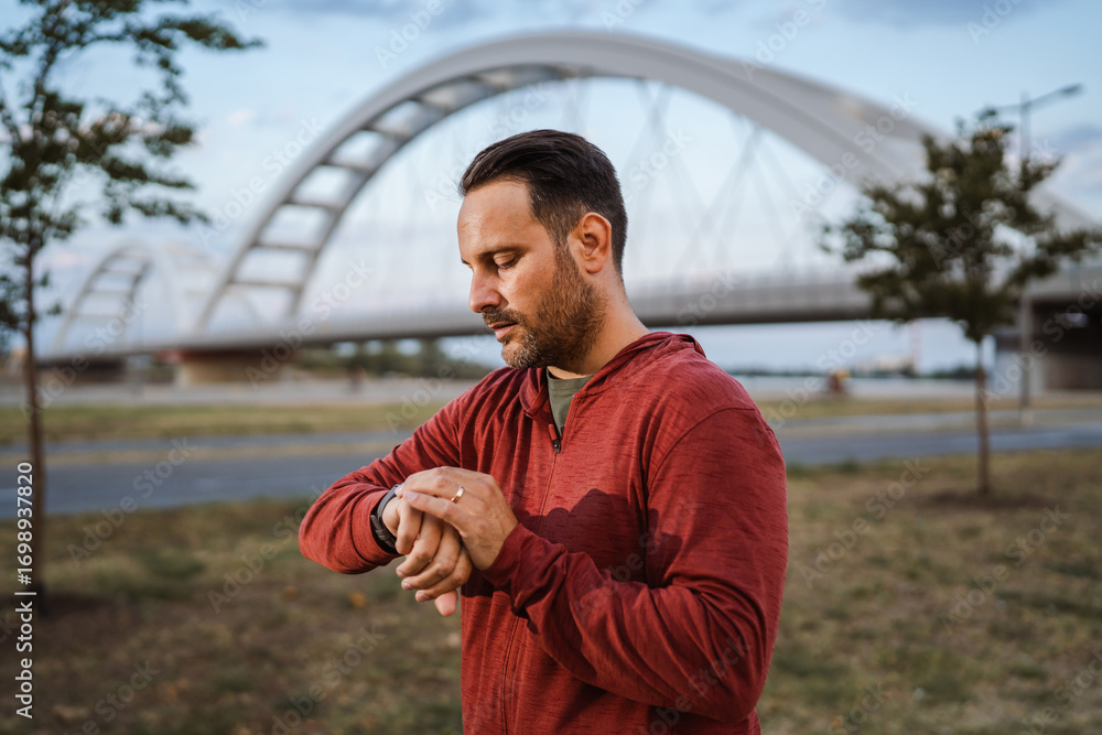 Male athlete checking time on smart watch after running near bridge