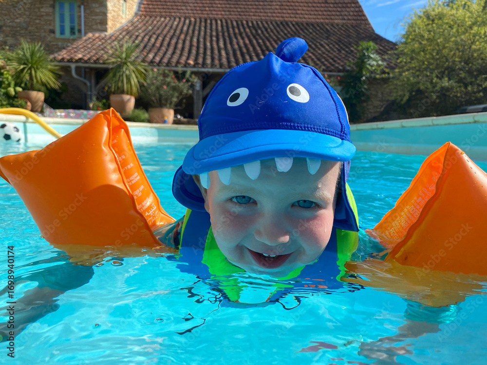 A two year old boy wearing arm bands splashes and plays in a swimming pool during summer