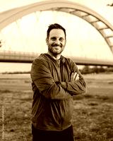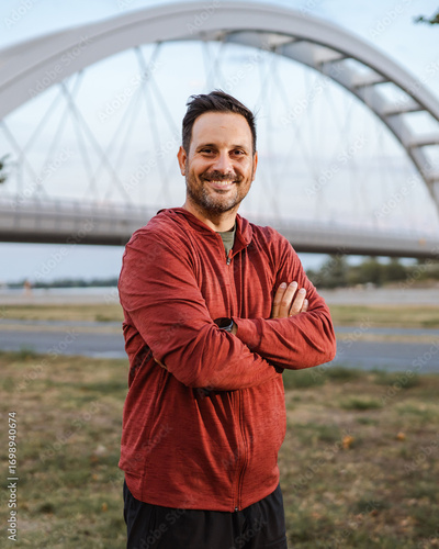 Portrait of smiling sportsman standing with crossed arms by bridge
