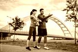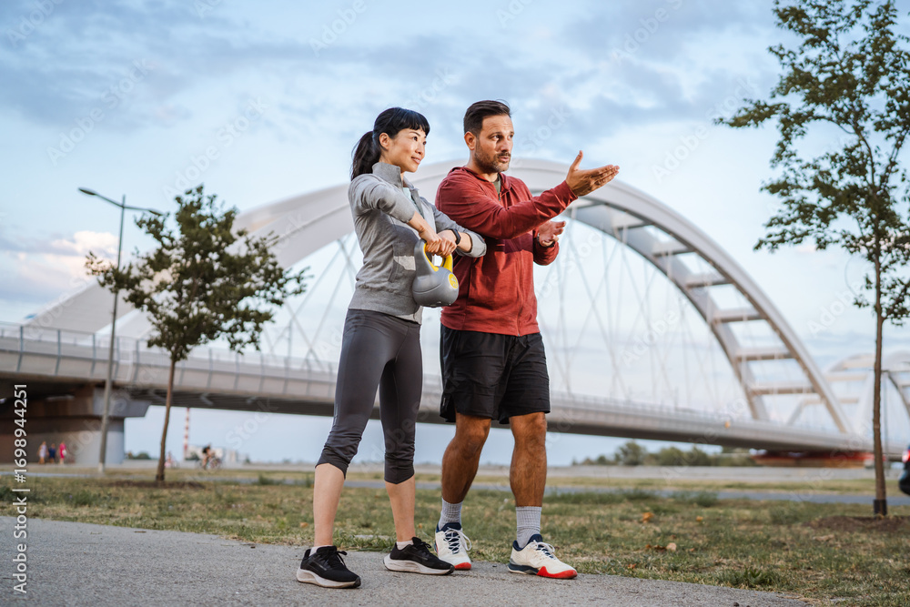 Personal trainer coaching woman doing kettle bell squats outdoors
