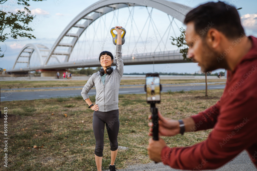 Fitness influence lifting kettle bell while recording workout video outdoors