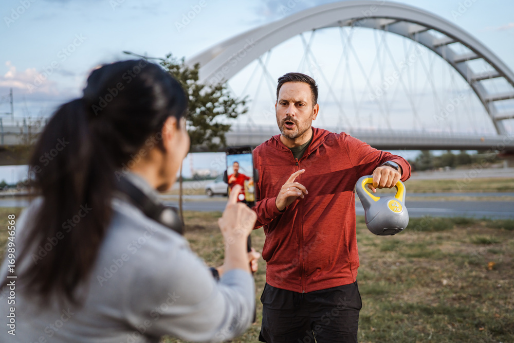 Personal trainer recording outdoor workout with smart phone and gimbals