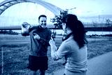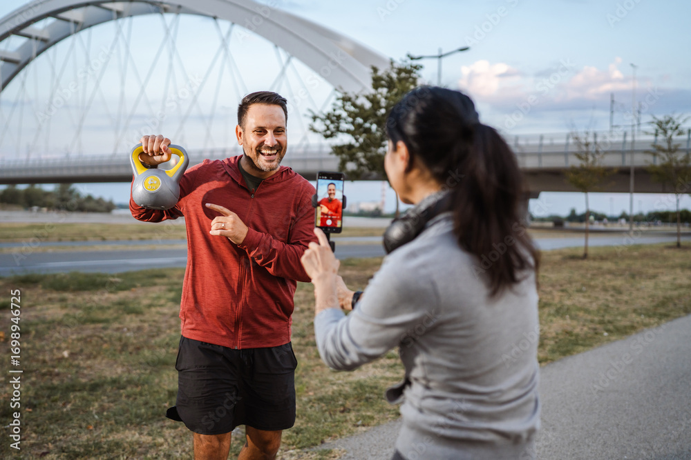 Personal trainer recording outdoor workout with smart phone and gimbals