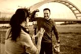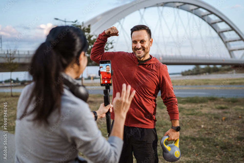 Personal trainer recording outdoor workout with smart phone and gimbals