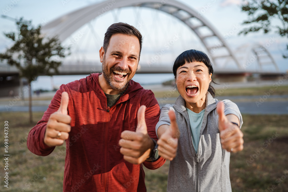 Happy multicultural couple showing thumbs up after workout outdoors