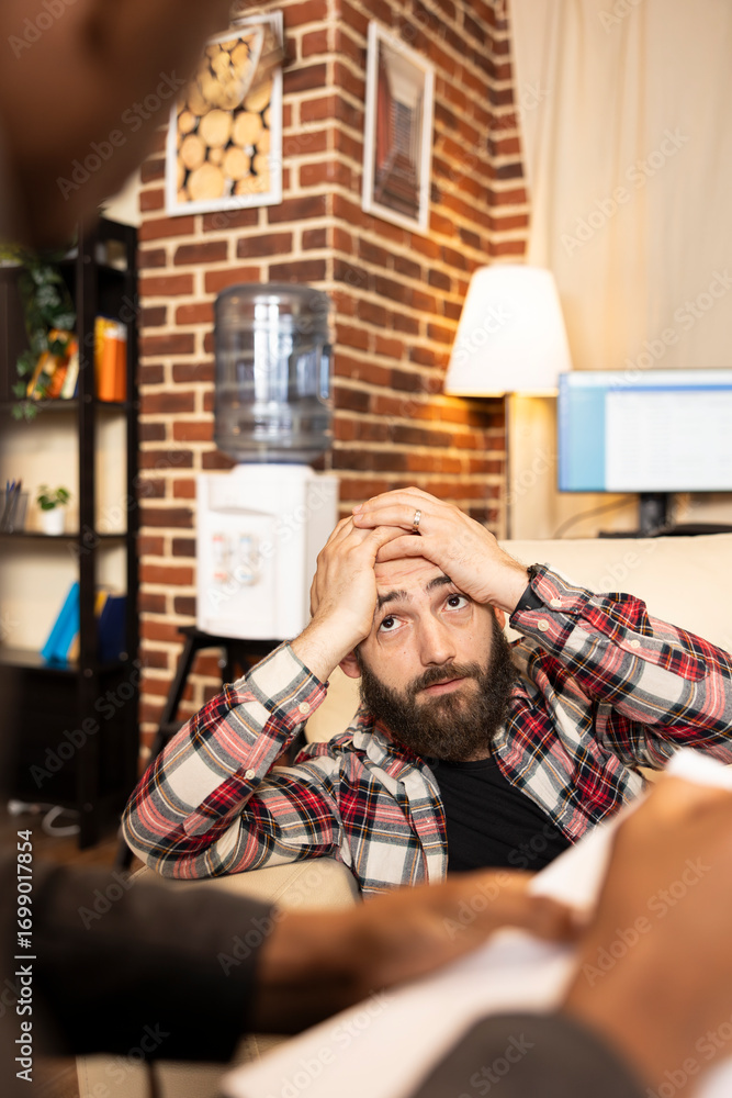 Close up of bearded man holding head in hands, reacting emotionally to mental struggles as black counselor writes notes on clipboard. Patient shares depressive story with therapist.