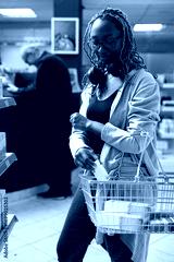 Dispensary female client inspecting medication dosage on labels, looking at the recommendation on boxes before buying pills from the apothecary shelves. Pharmacy products in a drugstore.