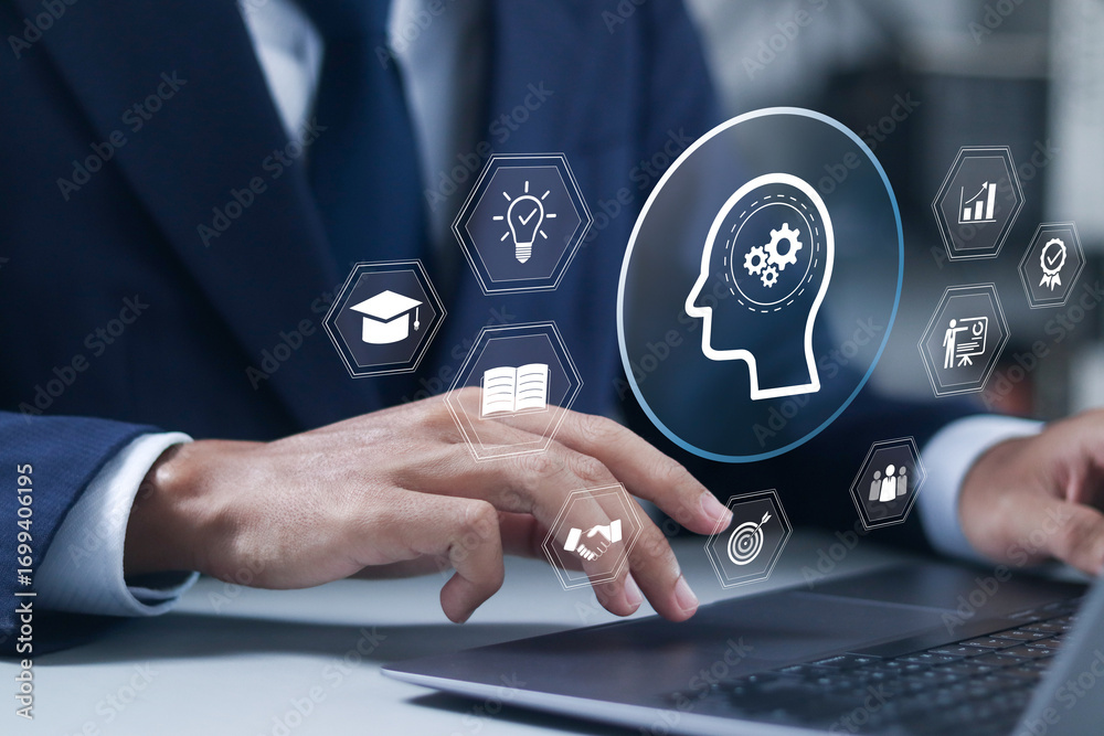 Skill concept. personal development, professional skills, competence, education, leader mindset and work performance is influenced by skills. Businessman using laptop with virtual icon.