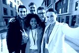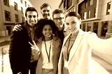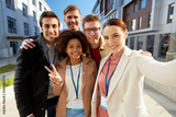team with conference badges taking selfie in city