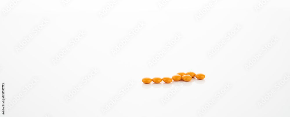 Yellow sugar coated tablets pill isolated on white background. Prescription drug concept in pharmaceutical industry healthcare and medicine with focus on pharmacology therapy and clinical treatment.