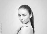 Portrait of young, beautiful and healthy woman: over cyan background. Healthcare, spa, makeup and face lifting concept.