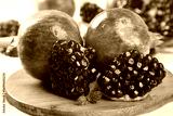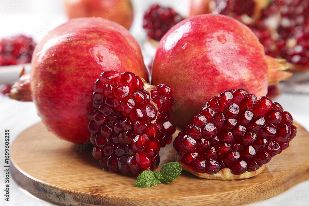Fresh Large Tunisian Pomegranates with Red Arils on Wooden Board - Healthy Organic Fruit