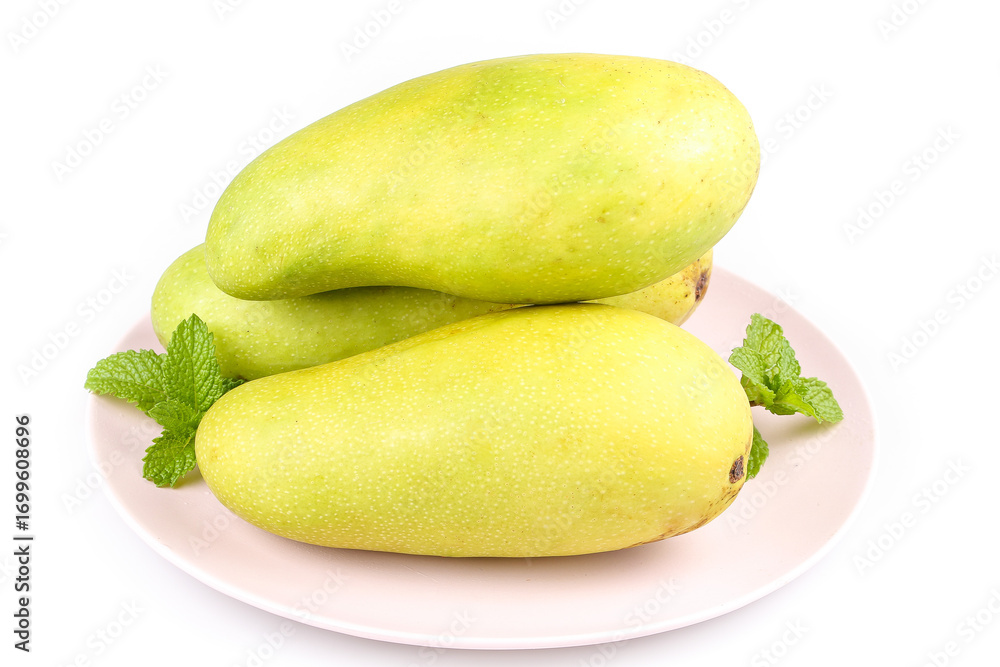 Fresh Golden Mango Fruit with Green Skin and Mint on White Background