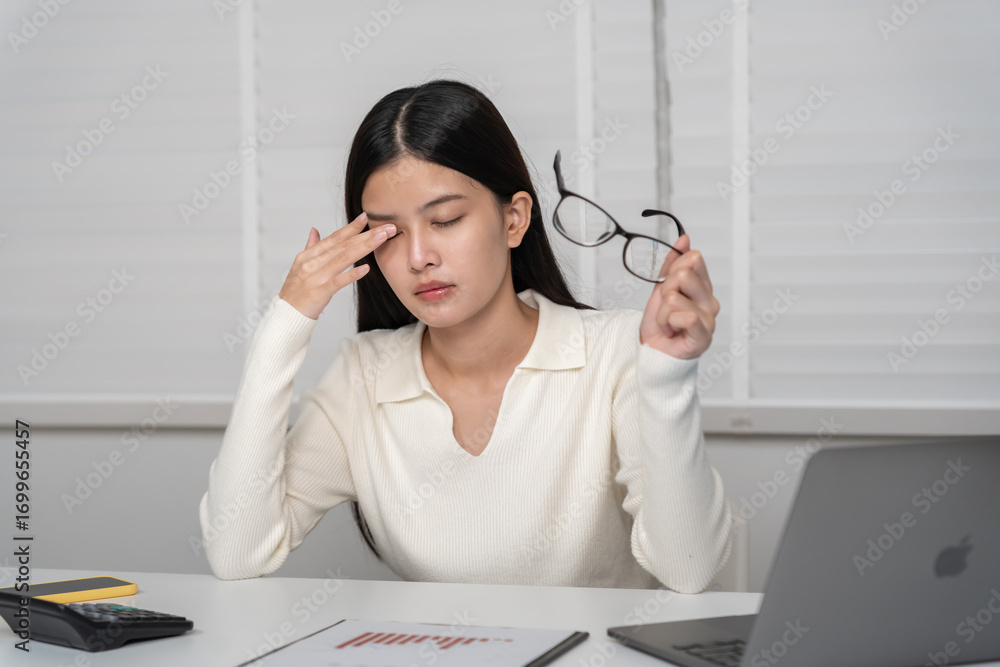 Eye problems, Asian women with tired and irritated eyes, eye rubbing, dry, eye pain after work, migraine, headache, blurred vision, photophobia, working in the dark, blue light from computer