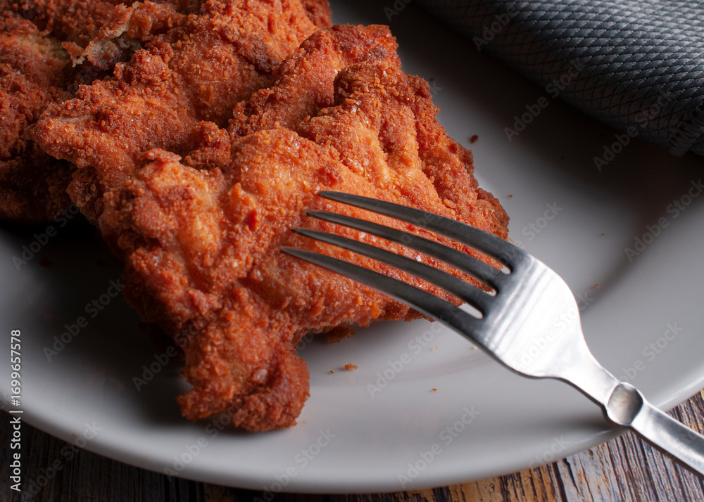 Breaded chicken on a white plate with a fork, high calorie foods macro photography side view