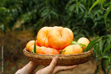 Fresh Yellow Peaches from Shandong Garden in Wicker Basket Held by Hands