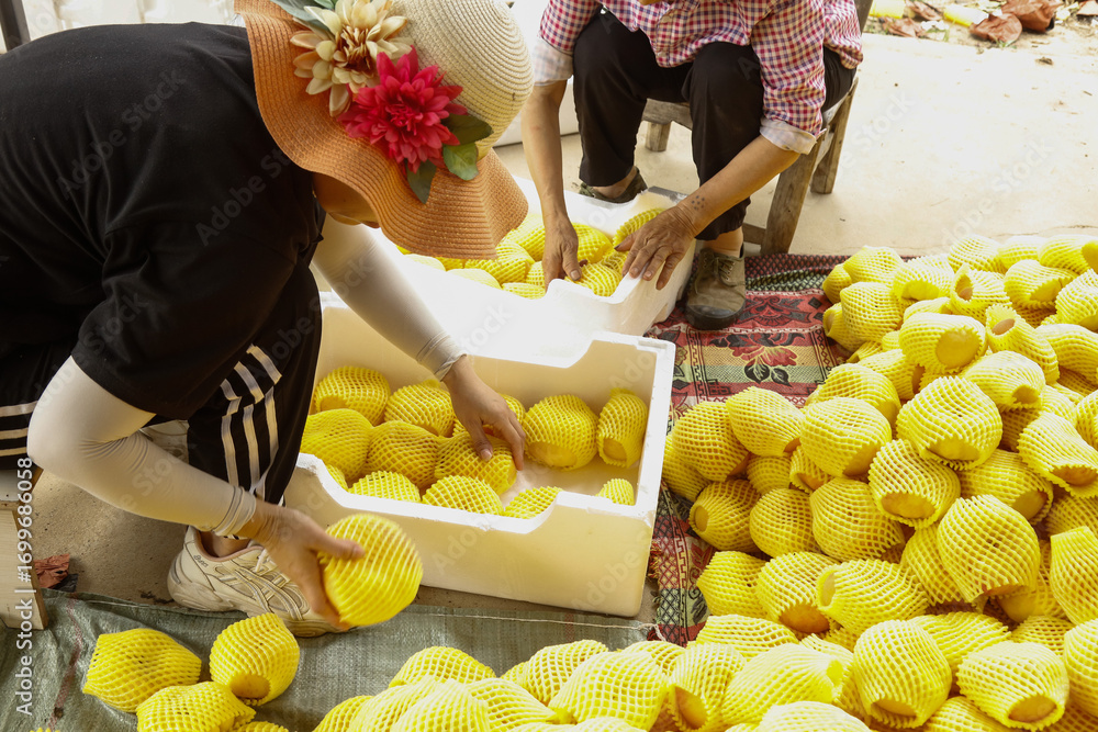 Workers Packing Yellow Peaches in Shipping Boxes at Shandong Orchard for Commercial Distribution