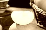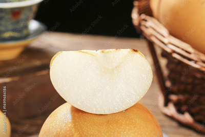 Fresh Yellow Pear Slice with Juicy White Flesh in Kitchen Setting