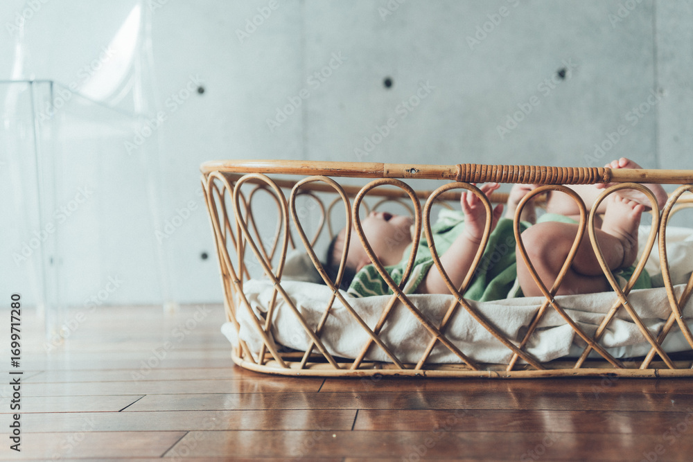 ラタンのクーファンに寝転ぶ赤ちゃん
