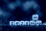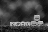 New year 2026. Wooden blocks with 2026. Green target and words GOAL, PLAN, ACTION on moss. Concept for setting sustainable business goals, environmental strategy and ESG action plans for new year.