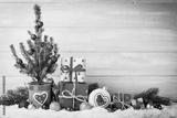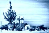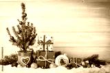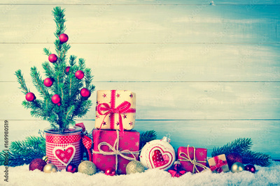 Vintage christmas background - Little christmas tree with gift boxes and decoration
