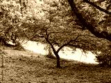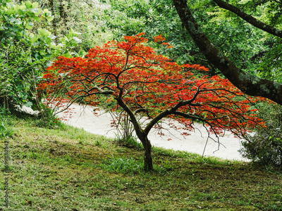 Vibrant red maple tree standing in a lush garden near a winding path in early autumn sunlight